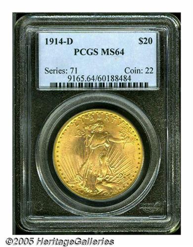 <B>1914-D<$20> MS64 PCGS.</B></I> This '14-D shows apricot-gold patina over lustrous surfaces that exhibit just a few minor marks scattered about, none of which are worthy of individual mention. The design features are well impressed.