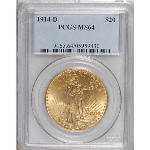 1914-D $20 MS64 PCGS. This lustrous double eagle has a