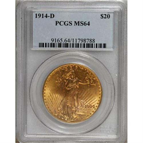 <B>1914-D $20 MS64 PCGS.</B></I> PCGS Population (1625/769). NGC Census: (1695/515). Mintage: 453,000. Numismedia Wsl. Price for NGC/PCGS coin in MS64: $950. (#9165)<BR><BR><B>Coin Engraver:</B> Augustus Saint-Gaudens<BR><BR><b>Shipping:</b> Coins & Currency (<a target="_blank" href="http://www.heritageauctions.com/common/shipping.php">view shipping information</a>\)
