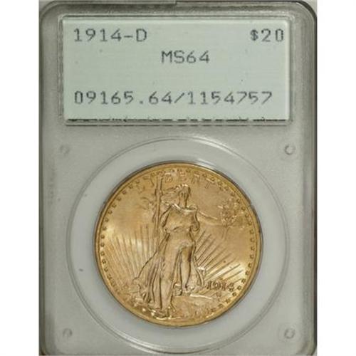 <B>1914-D $20 MS64 PCGS.</B></I> PCGS Population (1625/769). NGC Census: (1695/515). Mintage: 453,000. Numismedia Wsl. Price for NGC/PCGS coin in MS64: $950. (#9165)<BR><BR><B>Coin Engraver:</B> Augustus Saint-Gaudens<BR><BR><b>Shipping:</b> Coins & Currency (<a target="_blank" href="http://www.heritageauctions.com/common/shipping.php">view shipping information</a>\)