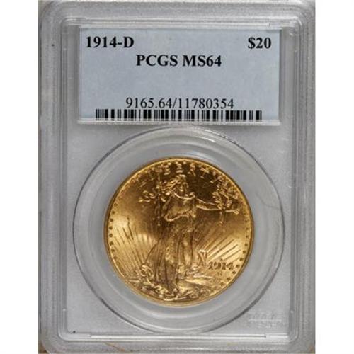 <B>1914-D $20 MS64 PCGS.</B></I> PCGS Population (1654/784). NGC Census: (1704/518). Mintage: 453,000. Numismedia Wsl. Price for NGC/PCGS coin in MS64: $950. (#9165)<BR><BR><B>Coin Engraver:</B> Augustus Saint-Gaudens<BR><BR><b>Shipping:</b> Coins & Currency (<a target="_blank" href="http://www.heritageauctions.com/common/shipping.php">view shipping information</a>)