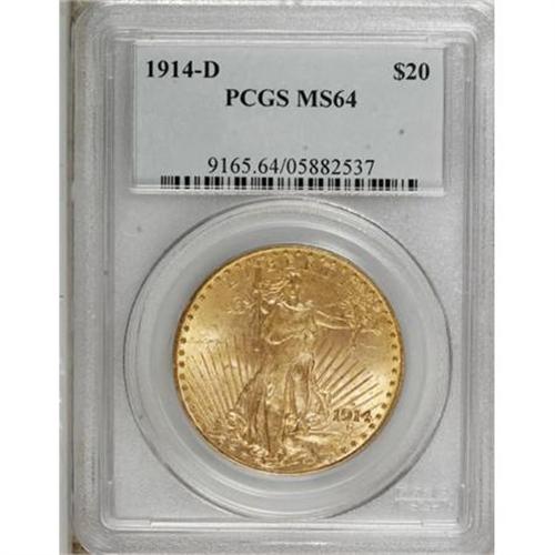 <B>1914-D $20 MS64 PCGS.</B></I> Well struck with elegant luster that graces soft yellow-gold surfaces. Minimally marked overall with delicate haze that drapes each side and a lone notable abrasion in the right obverse field.<BR><BR><B>Coin Engraver:</B> Augustus Saint-Gaudens<BR><BR><b>Shipping:</b> Coins & Currency (<a target="_blank" href="http://www.heritageauctions.com/common/shipping.php">view shipping information</a>)