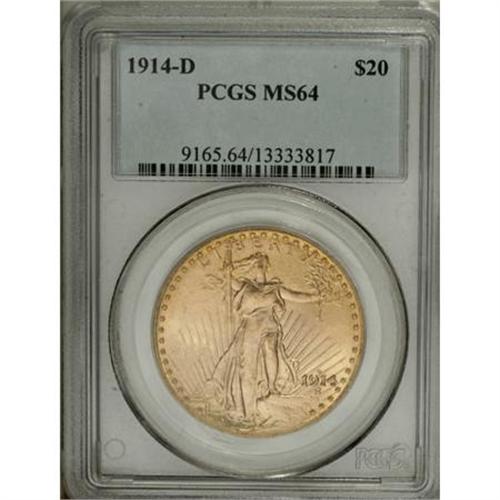 <B>1914-D $20 MS64 PCGS.</B></I> PCGS Population (1706/816). NGC Census: (1721/523). Mintage: 453,000. Numismedia Wsl. Price for NGC/PCGS coin in MS64: $950. (#9165)<BR><BR><B>Coin Engraver:</B> Augustus Saint-Gaudens<BR><BR><b>Shipping:</b> Coins & Currency (<a target="_blank" href="http://www.heritageauctions.com/common/shipping.php">view shipping information</a>)