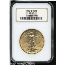 1914-D $20 MS65 NGC. A very pleasing Gem that has <B>1914-D $20 MS65 NGC.</B></I> A very pleasing Gem that has flashy luster, carefully preserved fields, and a very good strike. An excellent choice for an advanced gold type set. <BR><BR><B>Important notice:</B> Heritage usually auctions material at the rate of 200-250 lots per hour. On some occasions eBay Live bid software or the Internet may not be able to keep up with the pace of the auction. We recommend placing a realistic absentee bid now as insurance to avoid disappointment. Occasionally the auctioneer may eliminate or reject an eBay Live bid, and the auctioneer may also reopen a lot after the close of the eBay live bidding (usually because we missed an audience bid), and may reject your bid even if it shows you as the winning bidder. By bidding via eBay Live, you agree that Heritage may award the lot to another bidder at its sole discretion under the circumstances described above or any other reasonable circumstances. Since eBay bids are not shown to us until we open the lot on the floor, we treat those bids just like floor bids. In most cases the floor responds before the eBay bid is presented to us, due to Internet lag time, so for consistency we have made it a policy that floor bids are always considered first over tie eBay live bids. Also please note that all Heritage lots purchased through eBay Live carry a 20% Buyer's Premium. Please make sure you read the Terms and Conditions before you bid. This lot is being auctioned in conjunction with a live floor auction by Heritage Galleries & Auctioneers. All final auction and invoice information will be supplied by Heritage Galleries & Auctioneers, and all other information should be considered preliminary. Lot:7141