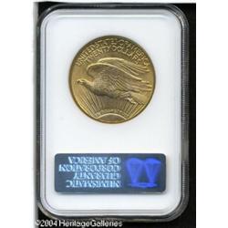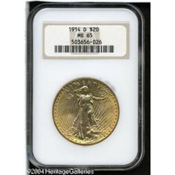 1914-D $20 MS65 NGC. Boldly struck with matte-like <B>1914-D $20 MS65 NGC.</B></I> Boldly struck with matte-like surfaces and bright satiny luster. A premium example of this popular date. <BR><BR><B>Important notice:</B> Heritage usually auctions material at the rate of 200-250 lots per hour. On some occasions eBay Live bid software or the Internet may not be able to keep up with the pace of the auction. We recommend placing a realistic absentee bid now as insurance to avoid disappointment. Occasionally the auctioneer may eliminate or reject an eBay Live bid, and the auctioneer may also reopen a lot after the close of the eBay live bidding (usually because we missed an audience bid), and may reject your bid even if it shows you as the winning bidder. By bidding via eBay Live, you agree that Heritage may award the lot to another bidder at its sole discretion under the circumstances described above or any other reasonable circumstances. Since eBay bids are not shown to us until we open the lot on the floor, we treat those bids just like floor bids. In most cases the floor responds before the eBay bid is presented to us, due to Internet lag time, so for consistency we have made it a policy that floor bids are always considered first over tie eBay live bids. Also please note that all Heritage lots purchased through eBay Live carry a 20% Buyer's Premium. Please make sure you read the Terms and Conditions before you bid. This lot is being auctioned in conjunction with a live floor auction by Heritage Galleries & Auctioneers. All final auction and invoice information will be supplied by Heritage Galleries & Auctioneers, and all other information should be considered preliminary. Lot:7140