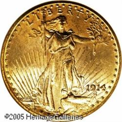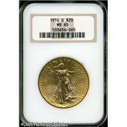 <B>1914-D $20 MS65 NGC.</B></I> Lustrous with appealing reddish-orange highlights. Originally from a high quality hoard of this scarcer D-mint Saint-Gaudens that was certified a few years ago. Lot:9552