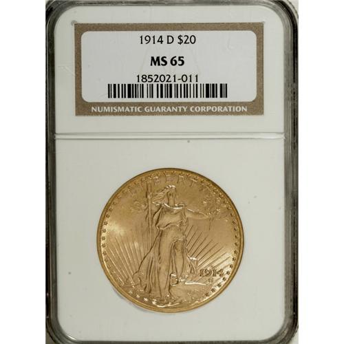 <B>1914-D $20 MS65 NGC.</B></I> The fields are well preserved, even for an MS65, and only a couple of thin marks on the eagle's flank and Liberty's right (facing) arm preclude a superior grade.<BR><BR><b>Shipping:</b> Coins & Currency (<a target="_blank" href="http://www.heritageauctions.com/common/shipping.php">view shipping information</a>)