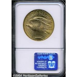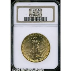 <B>1914-D<$20> MS65 NGC.</B></I> A better date with bright and lustrous surfaces. Pronounced granularity in the fields gives this issue superior eye appeal when compared to many of the other Saint-Gaudens Double Eagles. <BR><BR><B>Important notice:</B> Heritage usually auctions material at the rate of 200-250 lots per hour. On some occasions eBay Live bid software or the Internet may not be able to keep up with the pace of the auction. We recommend placing a realistic absentee bid now as insurance to avoid disappointment. Occasionally the auctioneer may eliminate or reject an eBay Live bid, and the auctioneer may also reopen a lot after the close of the eBay live bidding (usually because we missed an audience bid), and may reject your bid even if it shows you as the winning bidder. By bidding via eBay Live, you agree that Heritage may award the lot to another bidder at its sole discretion under the circumstances described above or any other reasonable circumstances. Since eBay bids are not shown to us until we open the lot on the floor, we treat those bids just like floor bids. In most cases the floor responds before the eBay bid is presented to us, due to Internet lag time, so for consistency we have made it a policy that floor bids are always considered first over tie eBay live bids. Also please note that all Heritage lots purchased through eBay Live carry a 20% Buyer's Premium. Please make sure you read the Terms and Conditions before you bid. </span></font></tr></table></td></tr></table>