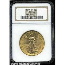 <B>1914-D<$20> MS65 NGC.</B></I> Similar in overall scarcity to the 1910-D and 1913-D, but not quite as difficult as the '13-D in Gem condition. Nevertheless, the '14-D is an uncommon issue in strict Gem condition. The finely granular surfaces have a lovely, bright overlay of satiny mint luster, and the reverse displays an especially pronounced interplay of rose and lilac coloration. Exceptional eye appeal. <BR><BR><B>Important notice:</B> Heritage usually auctions material at the rate of 200-250 lots per hour. On some occasions eBay Live bid software or the Internet may not be able to keep up with the pace of the auction. We recommend placing a realistic absentee bid now as insurance to avoid disappointment. Occasionally the auctioneer may eliminate or reject an eBay Live bid, and the auctioneer may also reopen a lot after the close of the eBay live bidding (usually because we missed an audience bid), and may reject your bid even if it shows you as the winning bidder. By bidding via eBay Live, you agree that Heritage may award the lot to another bidder at its sole discretion under the circumstances described above or any other reasonable circumstances. Since eBay bids are not shown to us until we open the lot on the floor, we treat those bids just like floor bids. In most cases the floor responds before the eBay bid is presented to us, due to Internet lag time, so for consistency we have made it a policy that floor bids are always considered first over tie eBay live bids. Also please note that all Heritage lots purchased through eBay Live carry a 20% Buyer's Premium. Please make sure you read the Terms and Conditions before you bid. </span></font></tr></table></td></tr></table>