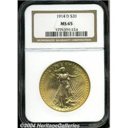 <B>1914-D<$20> MS65 NGC.</B></I> Matte-like surfaces emit flashing luster. The design elements are well impressed throughout. A light mark is noted on Liberty's upper leg.<BR><I>From The Sarasota Collection.</B></I> <BR><BR><B>Important notice:</B> Heritage usually auctions material at the rate of 200-250 lots per hour. On some occasions eBay Live bid software or the Internet may not be able to keep up with the pace of the auction. We recommend placing a realistic absentee bid now as insurance to avoid disappointment. Occasionally the auctioneer may eliminate or reject an eBay Live bid, and the auctioneer may also reopen a lot after the close of the eBay live bidding (usually because we missed an audience bid), and may reject your bid even if it shows you as the winning bidder. By bidding via eBay Live, you agree that Heritage may award the lot to another bidder at its sole discretion under the circumstances described above or any other reasonable circumstances. Since eBay bids are not shown to us until we open the lot on the floor, we treat those bids just like floor bids. In most cases the floor responds before the eBay bid is presented to us, due to Internet lag time, so for consistency we have made it a policy that floor bids are always considered first over tie eBay live bids. Also please note that all Heritage lots purchased through eBay Live carry a 20% Buyer's Premium. Please make sure you read the Terms and Conditions before you bid. </span></font></tr></table></td></tr></table>