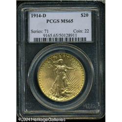 1914-D $20 MS65 PCGS. A better date with bright an <B>1914-D $20 MS65 PCGS.</B></I> A better date with bright and lustrous surfaces. Pronounced granularity in the fields gives this issue superior eye appeal when compared to many of the other Saint-Gaudens Double Eagles. Extremely difficult in higher grades. <BR><BR><B>Important notice:</B> Heritage usually auctions material at the rate of 200-250 lots per hour. On some occasions eBay Live bid software or the Internet may not be able to keep up with the pace of the auction. We recommend placing a realistic absentee bid now as insurance to avoid disappointment. Occasionally the auctioneer may eliminate or reject an eBay Live bid, and the auctioneer may also reopen a lot after the close of the eBay live bidding (usually because we missed an audience bid), and may reject your bid even if it shows you as the winning bidder. By bidding via eBay Live, you agree that Heritage may award the lot to another bidder at its sole discretion under the circumstances described above or any other reasonable circumstances. Since eBay bids are not shown to us until we open the lot on the floor, we treat those bids just like floor bids. In most cases the floor responds before the eBay bid is presented to us, due to Internet lag time, so for consistency we have made it a policy that floor bids are always considered first over tie eBay live bids. Also please note that all Heritage lots purchased through eBay Live carry a 20% Buyer's Premium. Please make sure you read the Terms and Conditions before you bid. This lot is being auctioned in conjunction with a live floor auction by Heritage Galleries & Auctioneers. All final auction and invoice information will be supplied by Heritage Galleries & Auctioneers, and all other information should be considered preliminary. Lot:7139