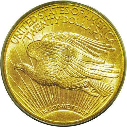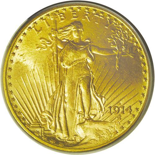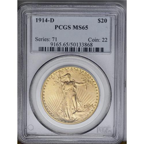 <B>1914-D<$20> MS65 PCGS.</B></I> Just a trace of pinkish color can be seen on the highly lustrous yellow-gold surfaces. Among Saint-Gaudens double eagles from the earlier years (through 1916), this is one of the common dates, a good opportunity for the type collector. The surfaces have a softly frosty appearance from slight granularity, common to many of the earlier dates in this series.<BR><I>From The Jackson Hole Collection.</B></I>