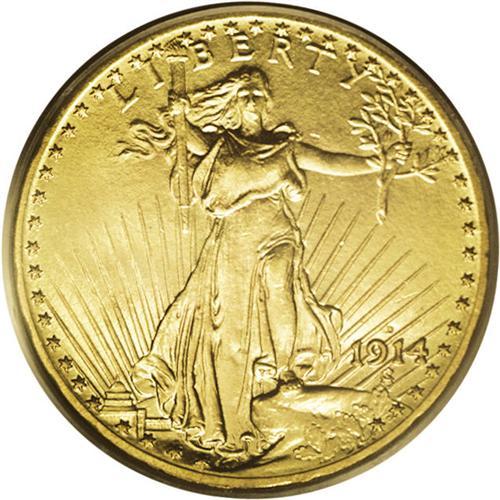 <B>1914-D<$20> MS65 PCGS.</B></I> Frosty and lustrous with brilliant yellow surfaces and pale orange toning. All of the design elements are boldly defined. This date is considered to be a common one, although it is somewhat scarcer than its San Francisco Mint brother. In grades higher than MS65, this date is quite rare, as are most Saint-Gaudens double eagles.