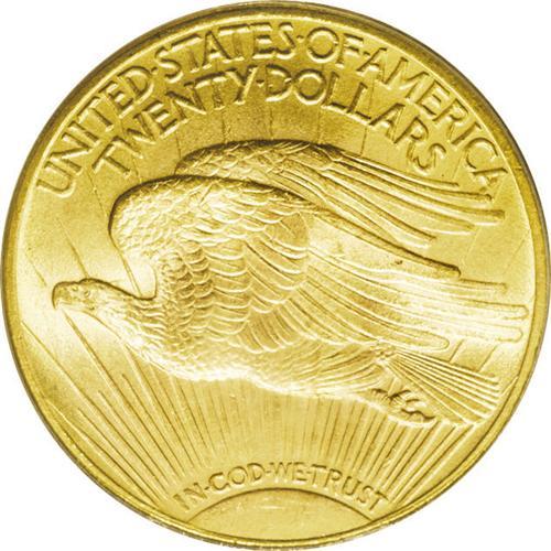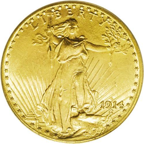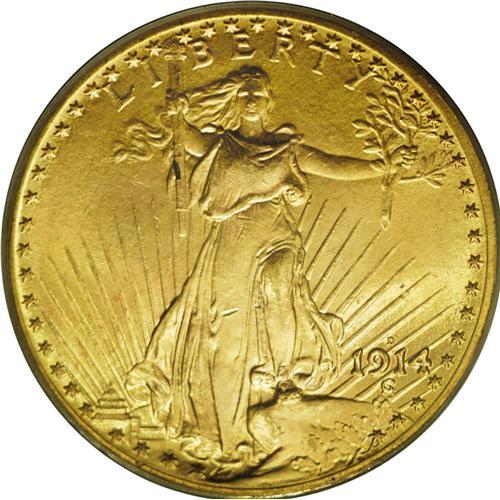 <B>1914-D<$20> MS65 PCGS.</B></I> In any grade less than Gem BU, the 1914-D is a rather nondescript issue that receives little attention. In MS65, however, it is quite scarce. Lustrous surfaces display sharply struck devices, including strong definition on Liberty's face, fingers, and toes, and on the eagle's feathers. Peach-gold patina imbued with traces of lime-green bathes both sides. The only mark of note occurs on Liberty's right leg above the knee.<BR><I>From The Worth Bruntjen Collection.</B></I>