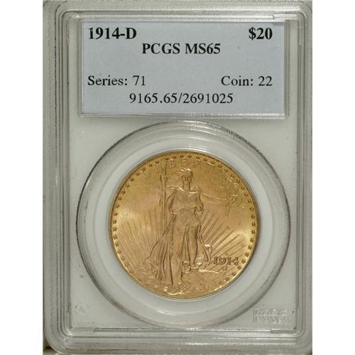 <B>1914-D $20 MS65 PCGS.</B></I> This attractive Gem has rich pumpkin-gold toning and penetrating cartwheel luster. Attentively struck and lightly abraded with a particularly clean reverse.<BR><BR><b>Shipping:</b> Coins & Currency (<a target="_blank" href="http://www.heritageauctions.com/common/shipping.php">view shipping information</a>)