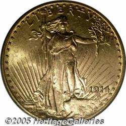<B>1914-D $20 MS65 PCGS.</B></I> This is a sharply struck Gem with exceptional eye appeal. The surfaces have a natural granularity, as struck, with satiny yellow luster. The '14-D is one of many common dates that is rare in Gem condition.