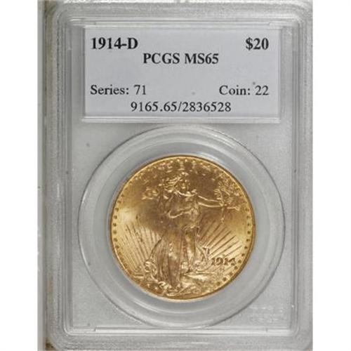 <B>1914-D $20 MS65 PCGS.</B></I> A richly textured product of the Denver mint with exciting orange-peel surfaces and extremely clean fields. While this issue is offered with some frequency in Gem grades, few are found finer. Some obverse marks in the lower left quadrant are well-concealed within the rays of the sun.<BR><BR><B>Coin Engraver:</B> Augustus Saint-Gaudens<BR><BR><b>Shipping:</b> Coins & Currency (<a target="_blank" href="http://www.heritageauctions.com/common/shipping.php">view shipping information</a>)