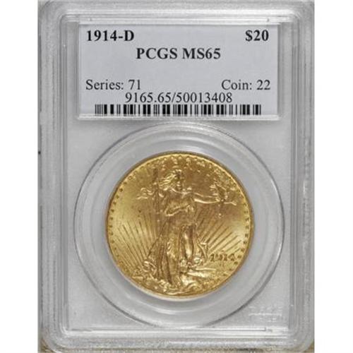 <B>1914-D $20 MS65 PCGS.</B></I> Frosty apricot-gold surfaces are laced with mint-green tints, and exhibit exquisitely struck design elements. A few grade-consistent marks are not bothersome.<BR><BR><B>Coin Engraver:</B> Augustus Saint-Gaudens<BR><BR><b>Shipping:</b> Coins & Currency (<a target="_blank" href="http://www.heritageauctions.com/common/shipping.php">view shipping information</a>)