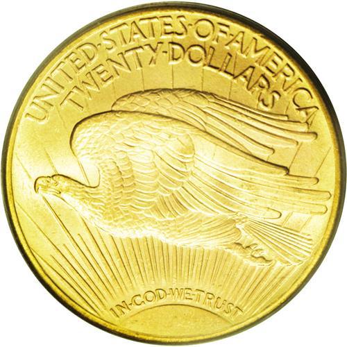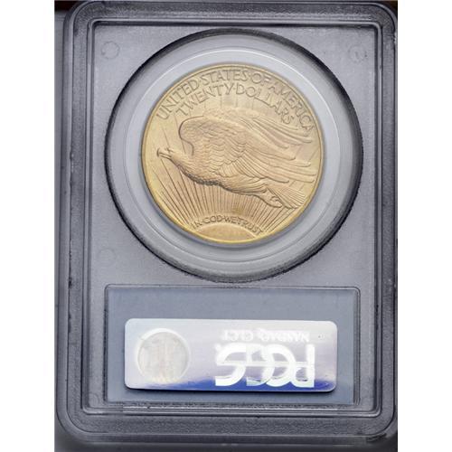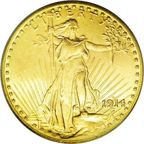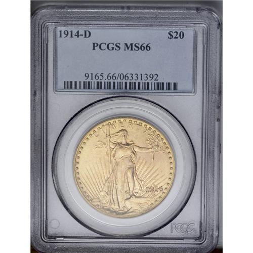 <B>1914-D<$20> MS66 PCGS.</B></I> A boldly struck Premium Gem that has original green-golden and peach patina. The reverse is virtually pristine, and the obverse is attractively preserved. An available issue in MS62 to MS64 grades, the 1914-D becomes scarce as a Gem and is decidedly rare in the lofty MS66 grade. Population: 44 in 66, 1 finer (5/06).