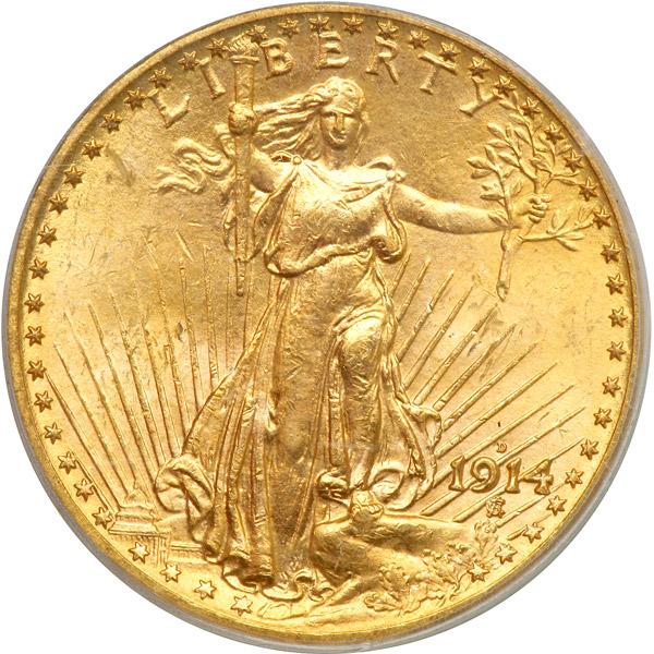 1914-D $20 St. Gaudens. PCGS graded MS-65. Softly toned and quite special. A worldly measure of pouring cartwheel luster livens up the wide expanse of satiny surface here. The fields are for all intents and purposes immaculate, or very close to it, while the strike is intrepid enough to call for special mention. Pop 914; 58 finer (PCGS # 9165) .