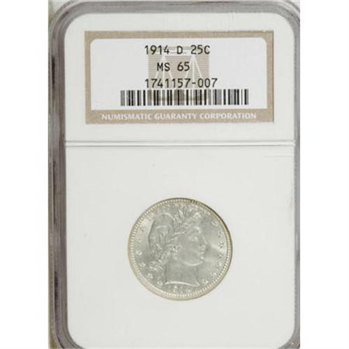 <B>1914-D 25C MS65 NGC.</B></I> A few light tan freckles gravitate to the margins of this D-mint quarter. The design elements exhibit great detail, and both sides are awash in bright luster. A couple of minute marks on the obverse portrait are mentioned for complete accuracy. Census: 30 in 65, 5 finer (1/08).<BR><I>From The Southwest Collection.</B></I><BR><BR><B>Coin Engraver:</B> Charles E. Barber<BR><BR><b>Shipping:</b> Coins & Currency (<a target="_blank" href="http://www.heritageauctions.com/common/shipping.php">view shipping information</a>)