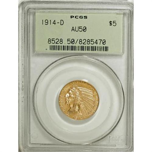<B>1914-D $5 AU50 PCGS.</B></I> PCGS Population (28/1382). NGC Census: (12/1551). Mintage: 247,000. Numismedia Wsl. Price for NGC/PCGS coin in AU50: $280. (#8528)<BR><BR><B>Coin Engraver:</B> Bela Lyon Pratt<BR><BR><b>Shipping:</b> Coins & Currency (<a target="_blank" href="http://www.heritageauctions.com/common/shipping.php">view shipping information</a>)