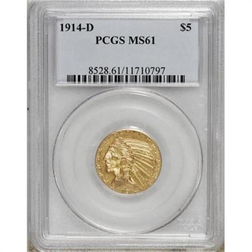 <B>1914-D $5 MS61 PCGS.</B></I> . PCGS Population (184/832). NGC Census: (427/735). Mintage: 247,000. Numismedia Wsl. Price for NGC/PCGS coin in MS61: $585. (#8528)<BR><BR><B>Coin Engraver:</B> Bela Lyon Pratt<BR><BR><b>Shipping:</b> Coins & Currency (<a target="_blank" href="http://www.heritageauctions.com/common/shipping.php">view shipping information</a>)