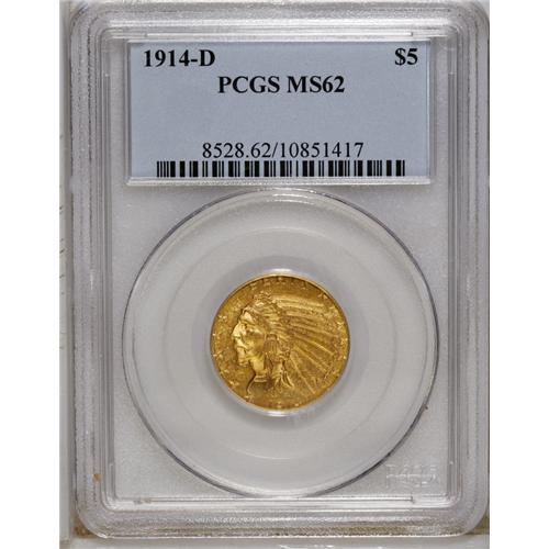 <B>1914-D $5 MS62 PCGS.</B></I> Attractive peach-gold color occupies lustrous surfaces on both sides, and most of the design features are well impressed. Light abrasions on the Indian's cheek and in the upper reverse field define the grade.<BR><BR><b>Shipping:</b> Coin/Currency (<a target="_blank" href="http://www.heritageauctions.com/common/shipping.php">view shipping information</a>)