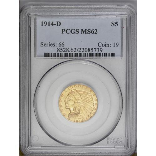 <B>1914-D<$5> MS62 PCGS.</B></I> The '14-D is a moderately scarce and somewhat overlooked issue that is quite elusive and expensive in higher Mint State grades. A bright coin, this specimen flaunts satin luster and the crisp strike that characterizes the issue. A few minor blemishes are noted on the reverse.