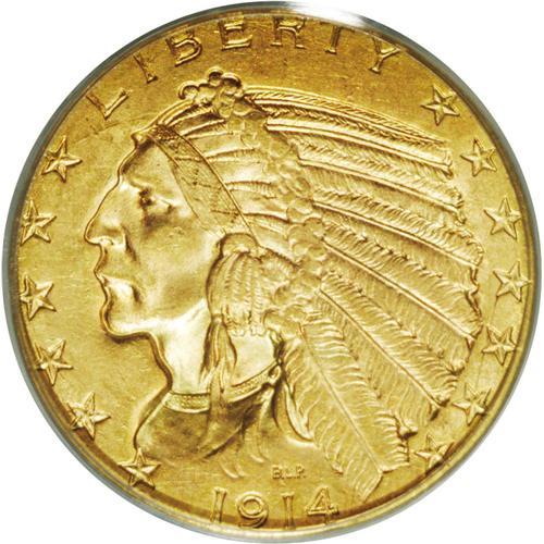 <B>1914-D<$5> MS63 PCGS.</B></I> A scarce Denver mint issue that is quite scarce in finer conditions. This sharply struck coin has mildly granular surfaces with a thick overlay of satiny luster. The surfaces are bright with a mixture of reddish-gold and pink coloration. Just a couple of marks on each side limit the grade.