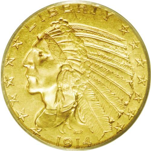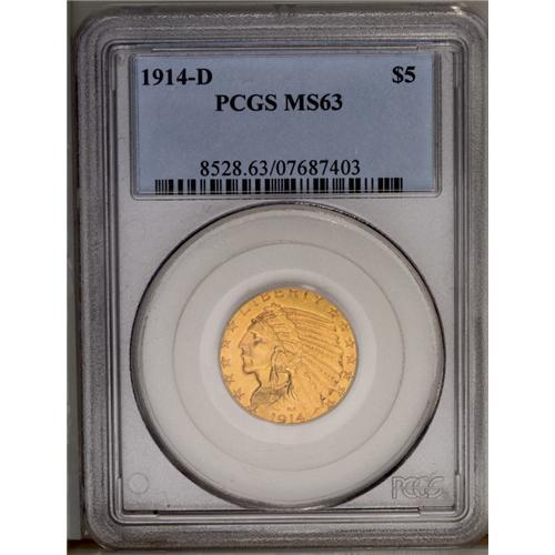 <B>1914-D<$5> MS63 PCGS.</B></I> David Akers called this issue "one of the more under-appreciated issues of the series." It is scarce in any grade, and a rarity in MS64 or finer grades. As usual, this example is fully lustrous and sharply struck with a bold mintmark. Both sides have frosty surfaces. A few faint slide marks are visible in the fields on the reverse.