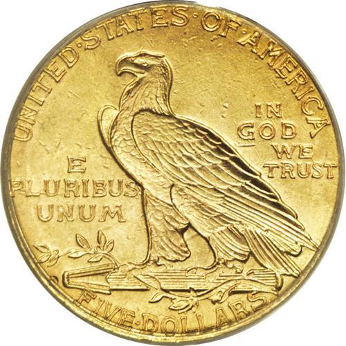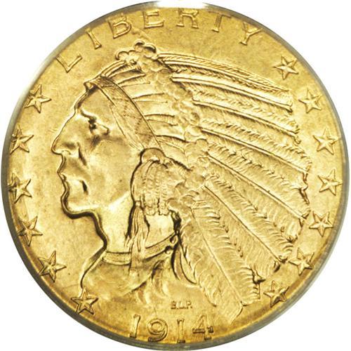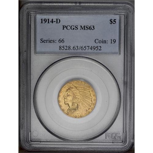 <B>1914-D<$5> MS63 PCGS.</B></I> The 1914-D is an overlooked issue in the Indian half eagle series, even though almost a quarter million pieces were produced. This is a very pleasing example that has smooth, softly frosted mint luster and only minor abrasions, almost all of them on the reverse. Just a bit lightly struck, as usual on this issue, with an indistinctly defined mintmark.
