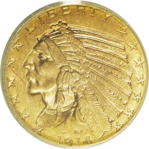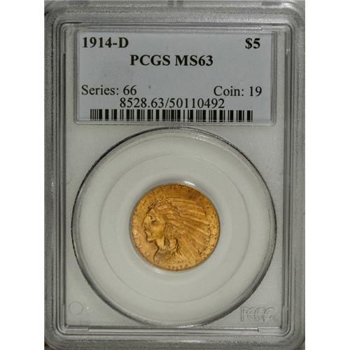 <B>1914-D $5 MS63 PCGS.</B></I> While lower Mint State grades offer plenty of examples for the collector, Select and better pieces are remarkably elusive. This highly appealing half eagle is one such piece. The lustrous surfaces are largely orange-gold, though areas of yellow-orange and reddish-orange are present on the obverse. The central devices are solidly struck, and the reverse has few marks. An abrasion near 9 o'clock on the obverse accounts for the grade.<BR><I>From The Dr. Eugene Cherny Collection of $5 and $10 Indians.</B></I><BR><BR><b>Shipping:</b> Coin/Currency (<a target="_blank" href="http://www.heritageauctions.com/common/shipping.php">view shipping information</a>) <BR><BR><B>Importan