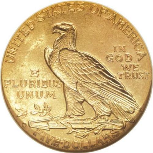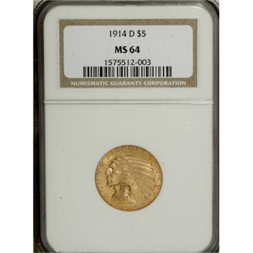 <B>1914-D $5 MS64 NGC.</B></I> Peach-gold surfaces are imbued with whispers of mint-green, and exude pleasing luster. The design features are sharply defined, having benefited from a well placed strike. Close examination reveals a few minor marks, primarily in the vulnerable, exposed fields that are raised on this design type.<BR><BR><b>Shipping:</b> Coins & Currency (<a target="_blank" href="http://www.heritageauctions.com/common/shipping.php">view shipping information</a>)