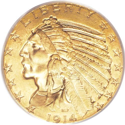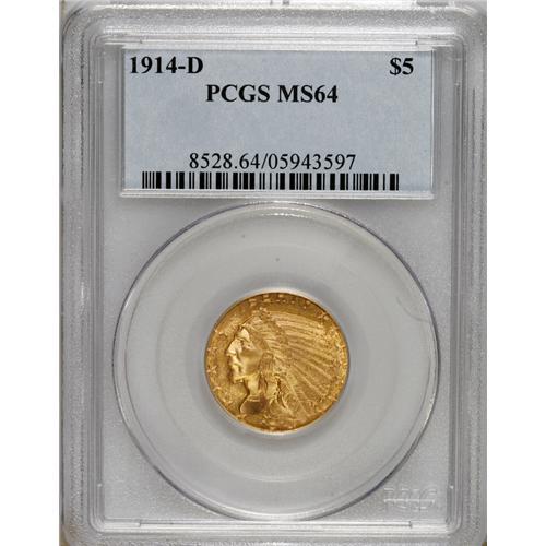 <B>1914-D $5 MS64 PCGS.</B></I> The shimmering khaki-gold fields and devices are generally smooth, and the Denver mintmark is well struck. Both major devices are also sharply defined, with the usual minor softness noted on the base of the headdress. A charming example of the final Denver Mint half eagle.<BR><BR><b>Shipping:</b> Coins & Currency (<a target="_blank" href="http://www.heritageauctions.com/common/shipping.php">view shipping information</a>)