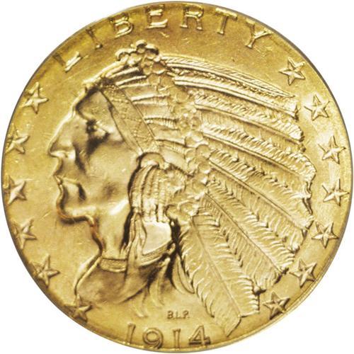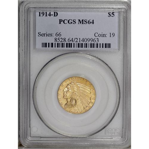 <B>1914-D $5 MS64 PCGS.</B></I> This sharply struck peach-gold near-Gem is both radiant and attractive. The mintmark has a narrow opening, but is nonetheless unmistakable. The 1914-D is much scarcer than the "common" Denver Mint Indian half eagle, the 1909-D. In fact, only 14 pieces have been certified finer by PCGS, which is less than one example for each year that the grading service has been in operation.<BR><I>From The James Paul Collection.</B></I><BR><BR><b>Shipping:</b> Coin/Currency (<a target="_blank" href="http://www.heritageauctions.com/common/shipping.php">view shipping information</a>)