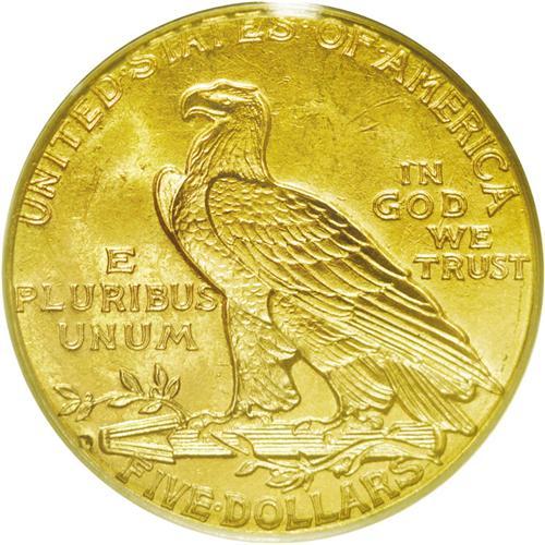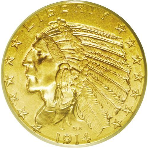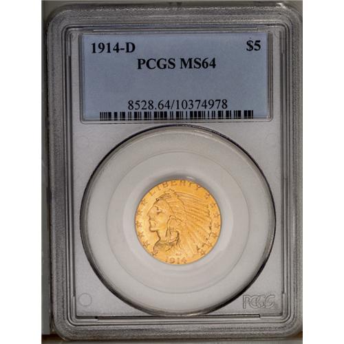 <B>1914-D<$5> MS64 PCGS.</B></I> What a lovely and original coin. The surfaces have a rich yellow-golden cast to them and are enhanced by sparkling mint luster, both elements are seen in equal proportions. Overall the coin has a well balanced appearance and is well struck with a few minuscule, grade-limiting surface marks on the reverse.