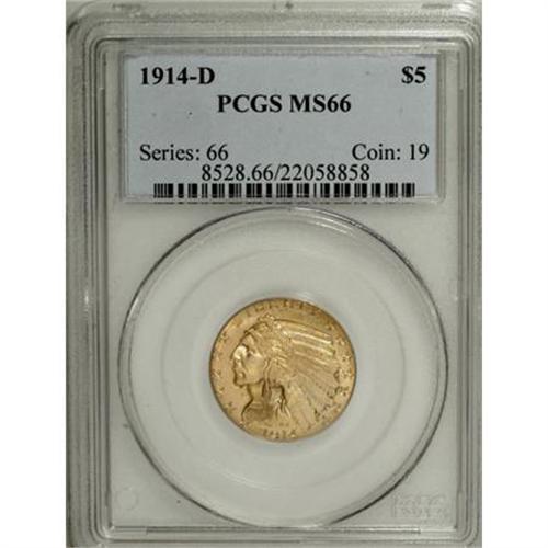 <B>1914-D $5 MS66 PCGS.</B></I> The present coin is among the standout specimens in this fine consignment, as one of only two MS66 pieces of the 1914-D issue certified at PCGS (7/07). NGC has also certified a single coin MS66. One could easily make the case that this coin is among the handful of finest Indian Head half eagles of the entire type, as PCGS has, including the inevitable resubmissions, certified 55 coins in this lofty Premium Gem grade. <BR> Although not a San Francisco Mint product, the 1914-D is nonetheless a scarcer issue among the Indian Head half eagle series, with a skimpy mintage of 247,000 pieces. In 2006, gold pundits Jeff Garrett and Ron Guth noted that this issue "is a scarcer date, and is frequently found well struck even on the feather tips and eagle's chest and wings. The surfaces are less granular and more lustrous than seen on many dates of this series. In terms of rarity, this date is available in most grades up to MS-64, but the populations fall off drastically at the gem MS-65 level, as seen on most dates. For this date and mint, a total of 20 coins have been graded as MS-65 ... . This places the issues (sic) just ahead of the 1914 Philadelphia issue in terms of rarity in gem, as the 14th scarcest."<BR> This coin offers so many superlative attributes that one hesitates to single one out to the detriment of the others. The surfaces are remarkably free of even the most picayune abrasions, from the exposed open fields on the reverse to the highpoints of the Indian's cheek on the obverse. Neither there nor in the left obverse field nearby--the focal points of the obverse--are there any abrasions above the microscopic sort. The color is a pleasing moderate honey-gold laced with tinges of mint-green, with generous luster and a bold strike. A small planchet flaw appears underneath OF on the reverse, but as a prestrike anomaly it does not affect the grade. More importantly, it fails to affect the enormous appeal of this stunning piece. Population: 2 in 66, 0 finer (7/07).<BR><I>From The Jim O'Neal Collection of Indian Half Eagles.</B></I><BR><BR><B>Coin Engraver:</B> Bela Lyon Pratt<BR><BR><b>Shipping:</b> Coins & Currency (<a target="_blank" href="http://www.heritageauctions.com/common/shipping.php">view shipping information</a>)
