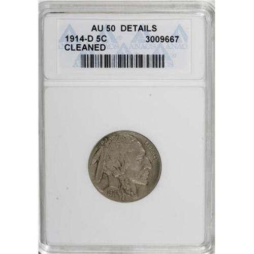 <B>1914-D 5C --Cleaned--ANACS. AU50 Details.</B></I> NGC Census: (11/621). PCGS Population (17/887). Mintage: 3,912,000. Numismedia Wsl. Price for NGC/PCGS coin in AU50: $271. (#3925)<BR><BR><B>Coin Engraver:</B> James E. Fraser<BR><BR><b>Shipping:</b> Coins & Currency (<a target="_blank" href="http://www.heritageauctions.com/common/shipping.php">view shipping information</a>)