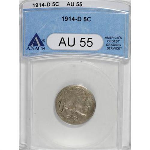 <B>1914-D 5C AU55 ANACS.</B></I> NGC Census: (24/589). PCGS Population (40/834). Mintage: 3,912,000. Numismedia Wsl. Price for NGC/PCGS coin in AU55: $292. (#3925)<BR><BR><B>Coin Engraver:</B> James E. Fraser<BR><BR><b>Shipping:</b> Coins & Currency (<a target="_blank" href="http://www.heritageauctions.com/common/shipping.php">view shipping information</a>)