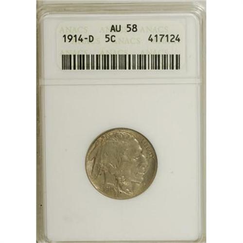 <B>1914-D 5C AU58 ANACS.</B></I> NGC Census: (68/520). PCGS Population (79/754). Mintage: 3,912,000. Numismedia Wsl. Price for NGC/PCGS coin in AU58: $308. (#3925)<BR><BR><B>Coin Engraver:</B> James E. Fraser<BR><BR><b>Shipping:</b> Coins & Currency (<a target="_blank" href="http://www.heritageauctions.com/common/shipping.php">view shipping information</a>)