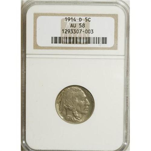 <B>1914-D 5C AU58 NGC.</B></I> NGC Census: (70/517). PCGS Population (75/731). Mintage: 3,912,000. Numismedia Wsl. Price for NGC/PCGS coin in AU58: $308. (#3925)<BR><BR><b>Shipping:</b> Coins & Currency (<a target="_blank" href="http://www.heritageauctions.com/common/shipping.php">view shipping information</a>)