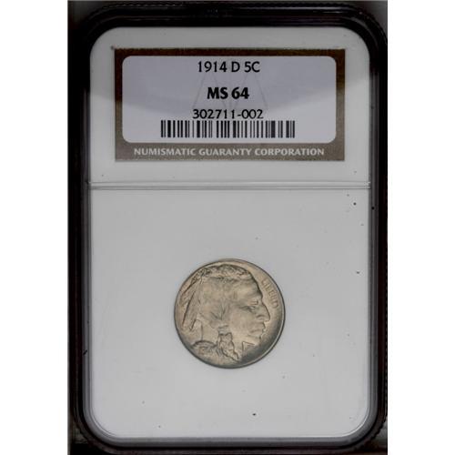 <B>1914-D<5C> MS64 NGC.</B></I> Well struck for this early Denver Mint issue, since only the bison's front shoulder and the hair above the braid knot lack precise definition. The bison's head and tail are bold, and LIBERTY is clear. The lustrous tan-gray surfaces are unblemished. <BR><BR><B>Important notice:</B> Heritage usually auctions material at the rate of 200-250 lots per hour. On some occasions eBay Live bid software or the Internet may not be able to keep up with the pace of the auction. We recommend placing a realistic absentee bid now as insurance to avoid disappointment. Occasionally the auctioneer may eliminate or reject an eBay Live bid, and the auctioneer may also reopen a lot after the close of the eBay live bidding (usually because we missed an audience bid), and may reject your bid even if it shows you as the winning bidder. By bidding via eBay Live, you agree that Heritage may award the lot to another bidder at its sole discretion under the circumstances described above or any other reasonable circumstances. Since eBay bids are not shown to us until we open the lot on the floor, we treat those bids just like floor bids. In most cases the floor responds before the eBay bid is presented to us, due to Internet lag time, so for consistency we have made it a policy that floor bids are always considered first over tie eBay live bids. Also please note that all Heritage lots purchased through eBay Live carry a 20% Buyer's Premium. Please make sure you read the Terms and Conditions before you bid. This lot is being auctioned in conjunction with a live floor auction by Heritage Galleries & Auctioneers. All final auction and invoice information will be supplied by Heritage Galleries & Auctioneers, and all other information should be considered preliminary. Lot:1040 <BR><BR><B>Winning Notification and Billing:</B> After the FINAL session in this auction is complete, Heritage will send e-mail and snail mail invoices. This process normally takes several days. All final auction and invoice information will be supplied by Heritage Galleries & Auctioneers, and all other information should be considered preliminary. <BR><BR>This auction will be conducted on a live auction floor and over the Internet through eBay Live. If you choose to place an absentee bid, please take a moment to <font color='#0000ff'><u><a href='http://pages.ebay.com/liveauctions/help/before/laabsentee.html'>learn how eBay Live absentee bidding works</a></u></font><font color='#000000'>