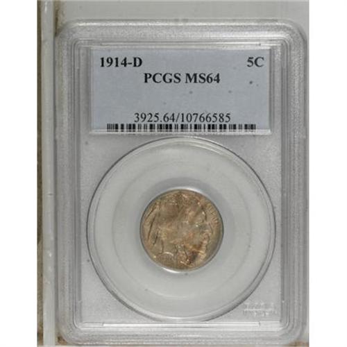 <B>1914-D 5C MS64 PCGS.</B></I> PCGS Population (281/171). NGC Census: (197/75). Mintage: 3,912,000. Numismedia Wsl. Price for NGC/PCGS coin in MS64: $585. (#3925)<BR><BR><b>Shipping:</b> Coins & Currency (<a target="_blank" href="http://www.heritageauctions.com/common/shipping.php">view shipping information</a>)