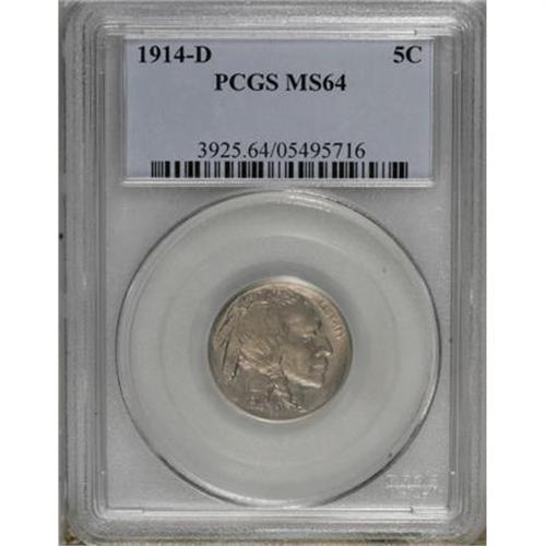 <B>1914-D 5C MS64 PCGS.</B></I> . PCGS Population (298/191). NGC Census: (202/75). Mintage: 3,912,000. Numismedia Wsl. Price for NGC/PCGS coin in MS64: $585. (#3925)<BR><BR><B>Coin Engraver:</B> James E. Fraser<BR><BR><b>Shipping:</b> Coins & Currency (<a target="_blank" href="http://www.heritageauctions.com/common/shipping.php">view shipping information</a>)