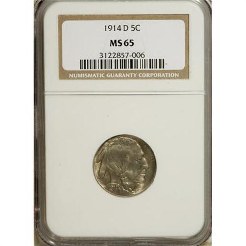 <B>1914-D 5C MS65 NGC.</B></I> Both sides of this moderately toned Gem offer soft, yet captivating luster. Delicate gold, pink, and violet shadings grace each side of this carefully preserved coin. Census: 65 in 65, 11 finer (3/08).<BR><BR><B>Coin Engraver:</B> James E. Fraser<BR><BR><b>Shipping:</b> Coins & Currency (<a target="_blank" href="http://www.heritageauctions.com/common/shipping.php">view shipping information</a>)