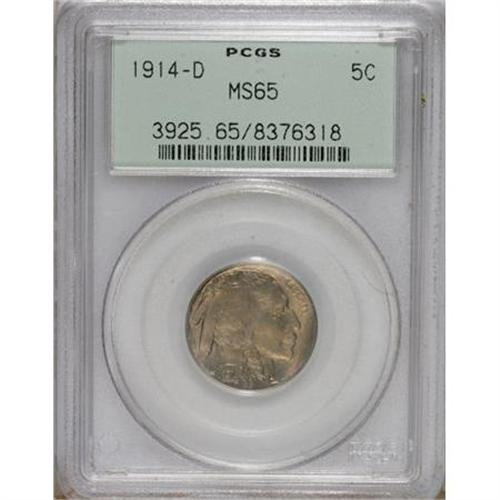 <B>1914-D 5C MS65 PCGS.</B></I> Both sides exhibit satin luster and are tinted a delicate antique-gold and steel-blue on the reverse. The dove-gray obverse remains untoned. Both sides of the piece are free of distractions. A difficult early Buffalo nickel issue at all grade levels, and a particularly attractive Gem example, in a green label PCGS holder. <BR><BR><b>Shipping:</b> Coins & Currency (<a target="_blank" href="http://www.heritageauctions.com/common/shipping.php">view shipping information</a>)