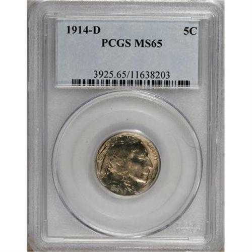 <B>1914-D 5C MS65 PCGS.</B></I> Bright lustrous surfaces display whispers of light beige, powder-blue, and light gray color. Generally well struck, except for softness in the lower parts of the date, as is typical for this issue. Both sides are free of significant marks.<BR><BR><b>Shipping:</b> Coins & Currency (<a target="_blank" href="http://www.heritageauctions.com/common/shipping.php">view shipping information</a>)