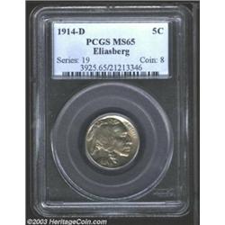 <TR><TD width="100%"><TABLE cellSpacing=1 cellPadding=3 width="100%" border=0><TBODY><TR><TD width="100%" bgColor=#79735c><FONT face=arial color=#ffffff size=3><B>Description</B> </FONT></TD></TR><TR><TD width="100%" bgColor=#ffffff><FONT face=arial size=2><B>1914-D 5C MS65 PCGS.</B></I> Rich olive and rose patina. While not fully struck in the centers, the peripheral legends are bold. A faint handling mark below the bison's shoulder is all that prevents an even higher grade, as the surfaces are otherwise exemplary.<BR><I>Ex: Louis E. Eliasberg, Sr. Collection (Bowers and Merena, 5/1996), lot 815, where it realized $1870.</B></I> </FONT></TD></TR></TBODY></TABLE></TD></TR></TBODY></TABLE><BR><A name=PricesRealized></A><TABLE cellSpacing=0 cellPadding=0 width="100%" bgColor=#000000 border=0><TBODY><TR><TD width="100%"><TABLE cellSpacing=1 cellPadding=3 width="100%" border=0><TBODY><TR><TD width="100%" bgColor=#79735c><A name=PR><FONT face=arial color=#ffffff size=3><B>Previous Prices from Heritage Auctions</B> </FONT></A></TD></TR><TR><TD bgColor=#f6f6ed><TABLE cellSpacing=0 cellPadding=0 width="100%" border=1><TBODY><TR><TD align=middle width="33%"><B>Date</B></TD><TD align=middle width="33%"><B>Service</B></TD><TD align=middle width="33%"><B>Price</B></TD></TR><TR bgColor=whitesmoke><TD width="33%"><B>09/01/1999</B></TD><TD width="33%">PCGS</TD><TD width="33%">$920.00</TD></TR><TR bgColor=whitesmoke><TD width="33%"><B>09/01/1999</B></TD><TD width="33%">PCGS</TD><TD width="33%">$920.00</TD></TR><TR bgColor=whitesmoke><TD width="33%"><B>09/01/1999</B></TD><TD width="33%">PCGS</TD><TD width="33%">$1,093.00</TD></TR><TR bgColor=whitesmoke><TD width="33%"><B>09/01/1999</B></TD><TD width="33%">PCGS</TD><TD width="33%">$1,093.00</TD></TR><TR bgColor=whitesmoke><TD width="33%"><B>08/01/1995</B></TD><TD width="33%">PCGS</TD><TD width="33%">$2,310.00</TD></TR><TR bgColor=whitesmoke><TD width="33%"><B>08/01/1995</B></TD><TD width="33%">PCGS</TD><TD width="33%">$2,310.00</TD></TR><TR bgColor=whitesmoke><TD width="33%"><B>06/01/1996</B></TD><TD width="33%">PCGS</TD><TD width="33%">$990.00</TD></TR><TR bgColor=whitesmoke><TD width="33%"><B>06/01/1996</B></TD><TD width="33%">PCGS</TD><TD width="33%">$990.00</TD></TR><TR bgColor=whitesmoke><TD width="33%"><B>03/01/2003</B></TD><TD width="33%">NGC</TD><TD width="33%">$1,035.00</TD></TR><TR bgColor=whitesmoke><TD width="33%"><B>03/01/2003</B></TD><TD width="33%">NGC</TD><TD width="33%">$1,035.00</TD></TR><TR bgColor=whitesmoke><TD width="33%"><B>05/31/2003</B></TD><TD width="33%">NGC</TD><TD width="33%">$1,092.50</TD></TR><TR bgColor=whitesmoke><TD width="33%"><B>05/31/2003</B></TD><TD width="33%">NGC</TD><TD width="33%">$1,092.50</TD></TR><TR bgColor=whitesmoke><TD width="33%"><B>12/25/2001</B></TD><TD width="33%">NGC</TD><TD width="33%">$1,050.00</TD></TR><TR bgColor=whitesmoke><TD width="33%"><B>12/25/2001</B></TD><TD width="33%">NGC</TD><TD width="33%">$1,050.00</TD></TR><TR bgColor=whitesmoke><TD width="33%"><B>01/23/2001</B></TD><TD width="33%">NGC</TD><TD width="33%">$925.00</TD></TR><TR bgColor=whitesmoke><TD width="33%"><B>01/23/2001</B></TD><TD width="33%">NGC</TD><TD width="33%">$925.00</TD></TR><TR bgColor=whitesmoke><TD width="33%"><B>05/19/1995</B></TD><TD width="33%">NGC</TD><TD width="33%">$797.50</TD></TR><TR bgColor=whitesmoke><TD width="33%"><B>05/19/1995</B></TD><TD width="33%">NGC</TD><TD width="33%">$797.50</TD></TR><TR bgColor=whitesmoke><TD width="33%"><B>07/31/1993</B></TD><TD width="33%">NGC</TD><TD width="33%">$852.50</TD></TR><TR bgColor=whitesmoke><TD width="33%"><B>07/31/1993</B></TD><TD width="33%">NGC</TD><TD width="33%">$852.50</TD></TR><TR bgColor=whitesmoke><TD width="33%"><B>08/17/1996</B></TD><TD width="33%">NGC</TD><TD width="33%">$550.00</TD></TR><TR bgColor=whitesmoke><TD width="33%"><B>08/17/1996</B></TD><TD width="33%">NGC</TD><TD width="33%">$550.00</TD></TR><TR bgColor=whitesmoke><TD width="33%"><B>11/01/1997</B></TD><TD width="33%">NGC</TD><TD width="33%">$880.00</TD></TR><TR bgColor=whitesmoke><TD width="33%"><B>11/01/1997</B></TD><TD width="33%">NGC</TD><TD width="33%">$880.00</TD></TR><TR bgColor=whitesmoke><TD width="33%"><B>03/01/2000</B></TD><TD width="33%">NGC</TD><TD width="33%">$805.00</TD></TR><TR bgColor=whitesmoke><TD width="33%"><B>03/01/2000</B></TD><TD width="33%">NGC</TD><TD width="33%">$805.00</TD></TR><TR bgColor=whitesmoke><TD width="33%"><B>06/01/2000</B></TD><TD width="33%">NGC</TD><TD width="33%">$863.00</TD></TR><TR bgColor=whitesmoke><TD width="33%"><B>06/01/2000</B></TD><TD width="33%">NGC</TD><TD width="33%">$863.00</TD></TR><TR bgColor=whitesmoke><TD width="33%"><B>06/01/1998</B></TD><TD width="33%">NGC</TD><TD width="33%">$880.00</TD></TR><TR bgColor=whitesmoke><TD width="33%"><B>06/01/1998</B></TD><TD width="33%">NGC</TD><TD width="33%">$880.00</TD></TR><TR bgColor=whitesmoke><TD width="33%"><B>03/01/2003</B></TD><TD width="33%">PCGS</TD><TD width="33%">$1,437.50</TD></TR><TR bgColor=whitesmoke><TD width="33%"><B>03/01/2003</B></TD><TD width="33%">PCGS</TD><TD width="33%">$1,437.50</TD></TR><TR bgColor=whitesmoke><TD width="33%"><B>03/01/2003</B></TD><TD width="33%">PCGS</TD><TD width="33%">$1,610.00</TD></TR><TR bgColor=whitesmoke><TD width="33%"><B>03/01/2003</B></TD><TD width="33%">PCGS</TD><TD width="33%">$1,610.00</TD></TR><TR bgColor=whitesmoke><TD width="33%"><B>01/11/2003</B></TD><TD width="33%">PCGS</TD><TD width="33%">$1,552.50</TD></TR><TR bgColor=whitesmoke><TD width="33%"><B>01/11/2003</B></TD><TD width="33%">PCGS</TD><TD width="33%">$1,552.50</TD></TR><TR bgColor=whitesmoke><TD width="33%"><B>11/23/2002</B></TD><TD width="33%">PCGS</TD><TD width="33%">$1,322.50</TD></TR><TR bgColor=whitesmoke><TD width="33%"><B>11/23/2002</B></TD><TD width="33%">PCGS</TD><TD width="33%">$1,322.50</TD></TR><TR bgColor=whitesmoke><TD width="33%"><B>09/28/2002</B></TD><TD width="33%">PCGS</TD><TD width="33%">$1,380.00</TD></TR><TR bgColor=whitesmoke><TD width="33%"><B>09/28/2002</B></TD>