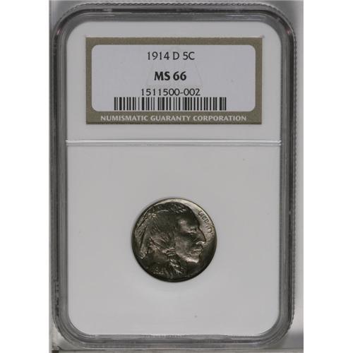 <B>1914-D<5C> MS66 NGC.</B></I> A gorgeous mix of rose and powder-blue travels over highly lustrous surfaces that are accented with occasional wisps of yellow-gold, especially in the peripheral areas. The design elements reveal a better-than-average strike, including virtual fullness in the date and the hair on the bison's head. A minor crack is visible between the RT of LIBERTY, and another above the Indian's braid. These cracks are typical for the issue, as the Denver Mint frequently used dies long after they became worn. Census: 10 in 66, 1 finer (6/06).